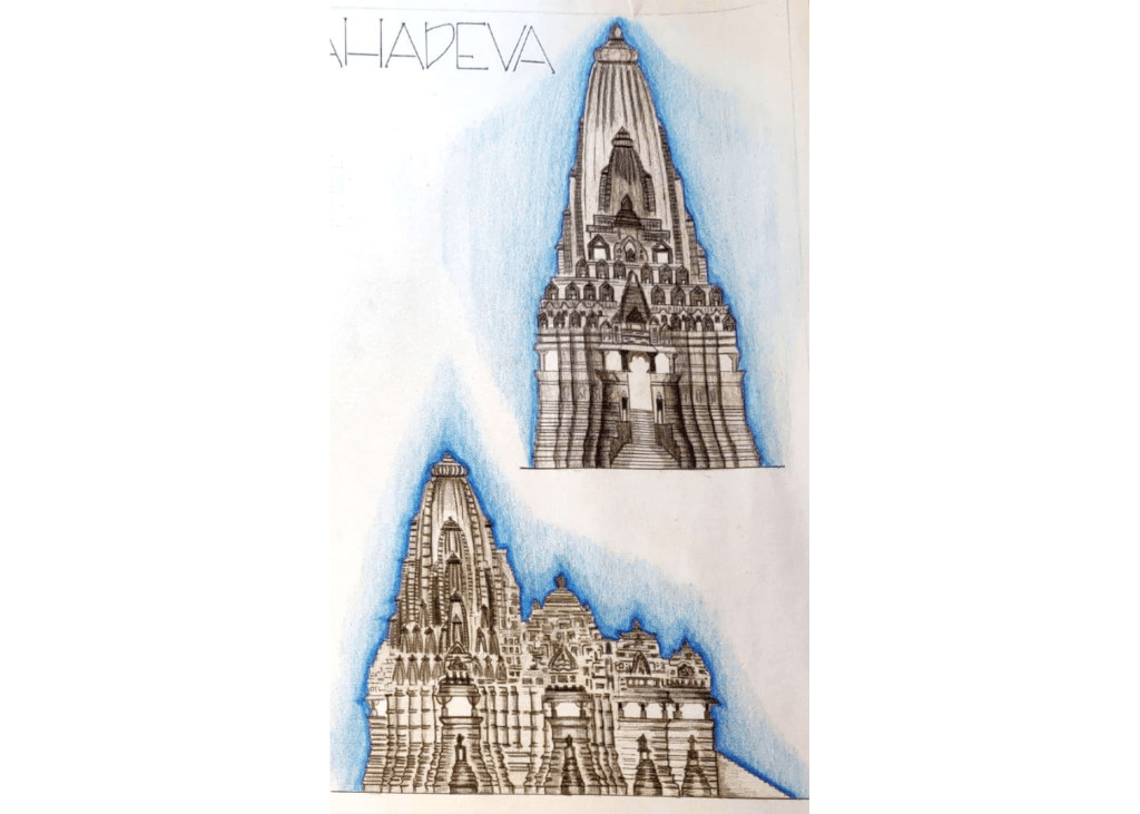 This is a Hindu temple called the Kandariya Mahadeva, the largest and tallest of the surviving temples at the temple site of Khajuraho, in central India. It is dedicated to Shiva, who is represented by the linga in the main shrine known as the womb chamber located at the heart of the building.
